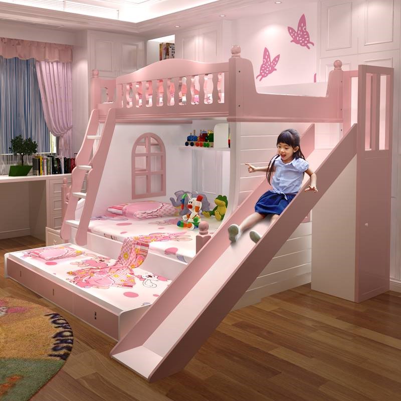 Mặc dù các bé gái thường có tính cách đáng yêu, dịu dàng, nữ tính nhưng không có nghĩa là bé không thích chơi đùa những trò chơi có cảm giác hơi mạnh một chút như trượt cầu tuột chẳng hạn. Việc thiết kế, trang trí phòng ngủ màu hồng với mẫu giường kết hợp với cầu tuột sẽ là một ý tưởng thú vị. Như vậy phòng ngủ không chỉ là nơi cho bé nghỉ ngơi, học tập mà còn có thể vui chơi một cách an toàn ngay trong tầm mắt của cha mẹ.