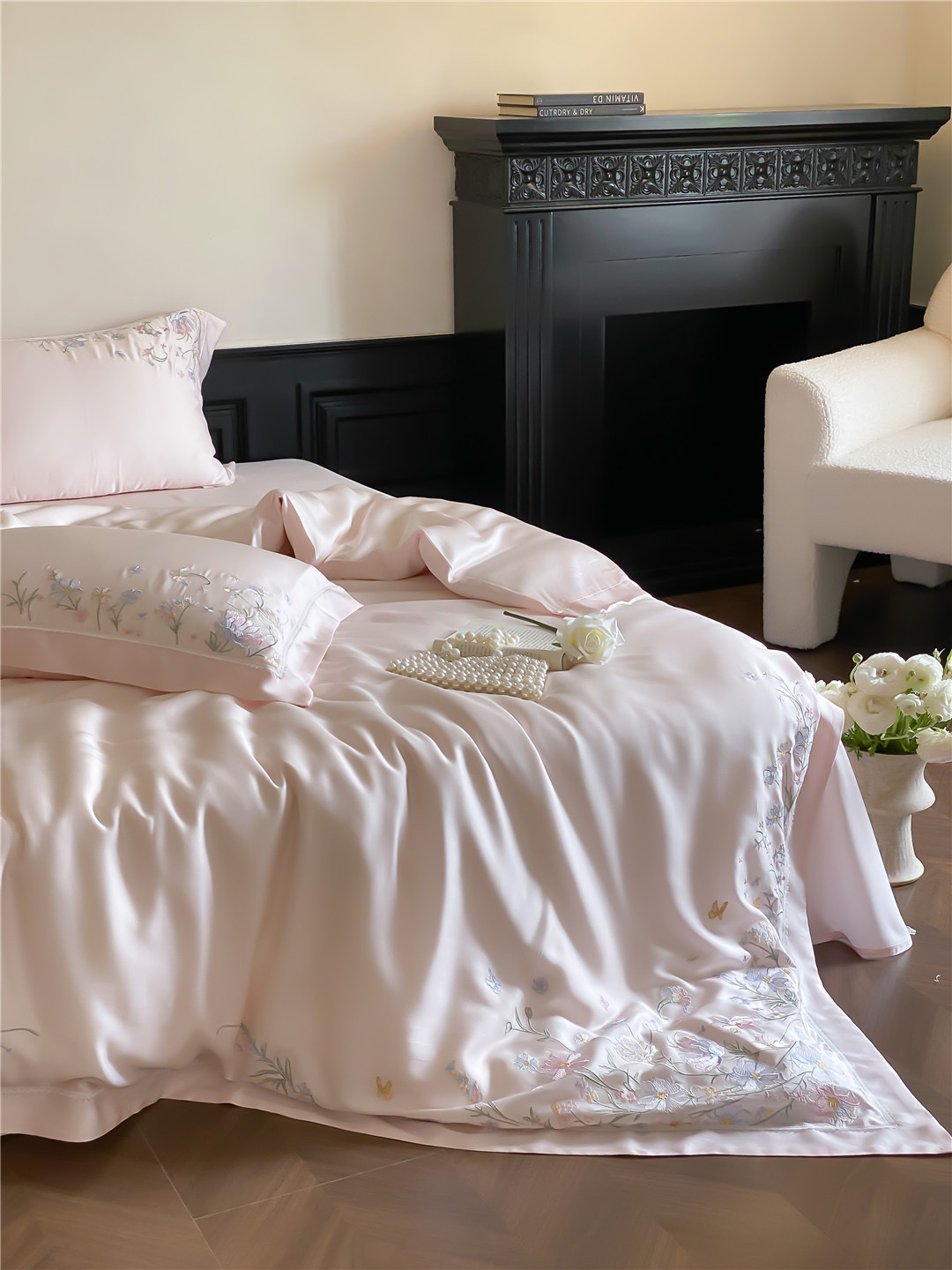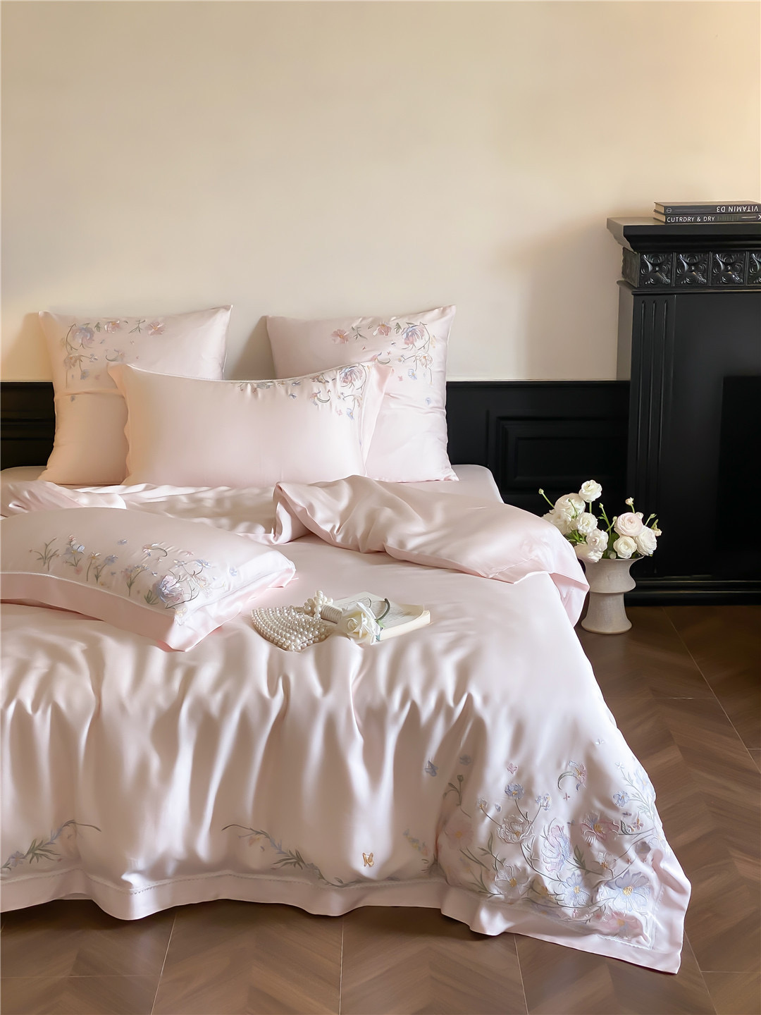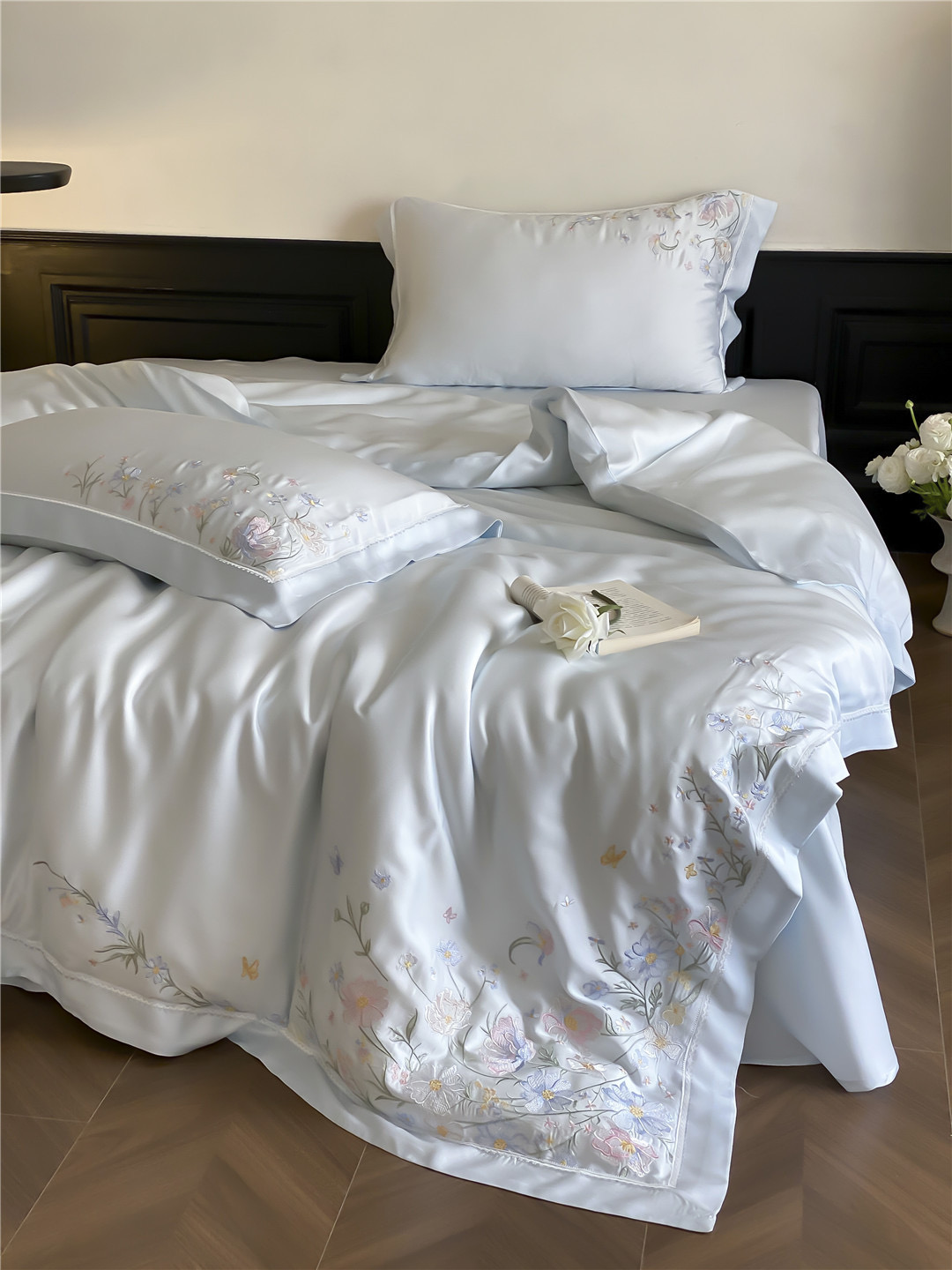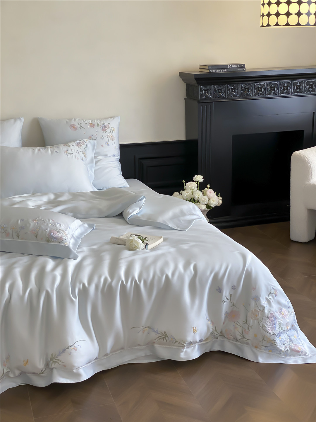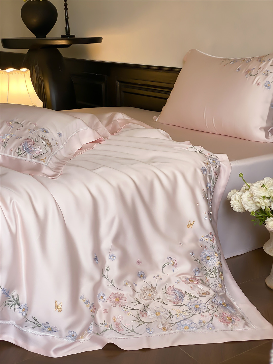 Bộ ga nổi bật với gam màu thanh lịch, kết hợp cùng họa tiết hoa thêu tinh xảo. Từng đường kim mũi chỉ đều toát lên vẻ nhẹ nhàng, sang trọng, mang lại cảm giác như một khu vườn dịu dàng ngay trong phòng ngủ. Đây không chỉ là chăn ga mà là một món decor nâng tầm không gian sống.