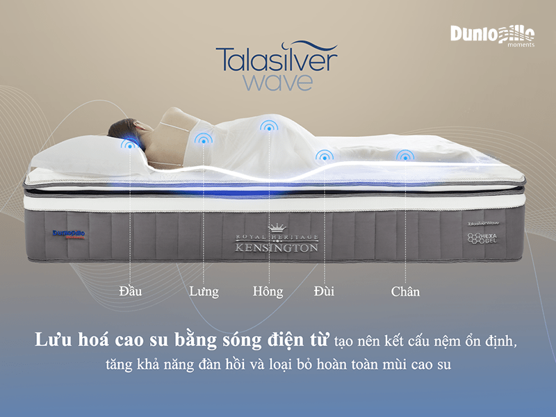 TalaSilver Wave là công nghệ mang tính cách mạng của Dunlopillo khi sử dụng sóng điện từ để lưu hóa cao su, tạo ra một cấu trúc đồng nhất làm tăng sự thoải mái và độ bền vượt thời gian.